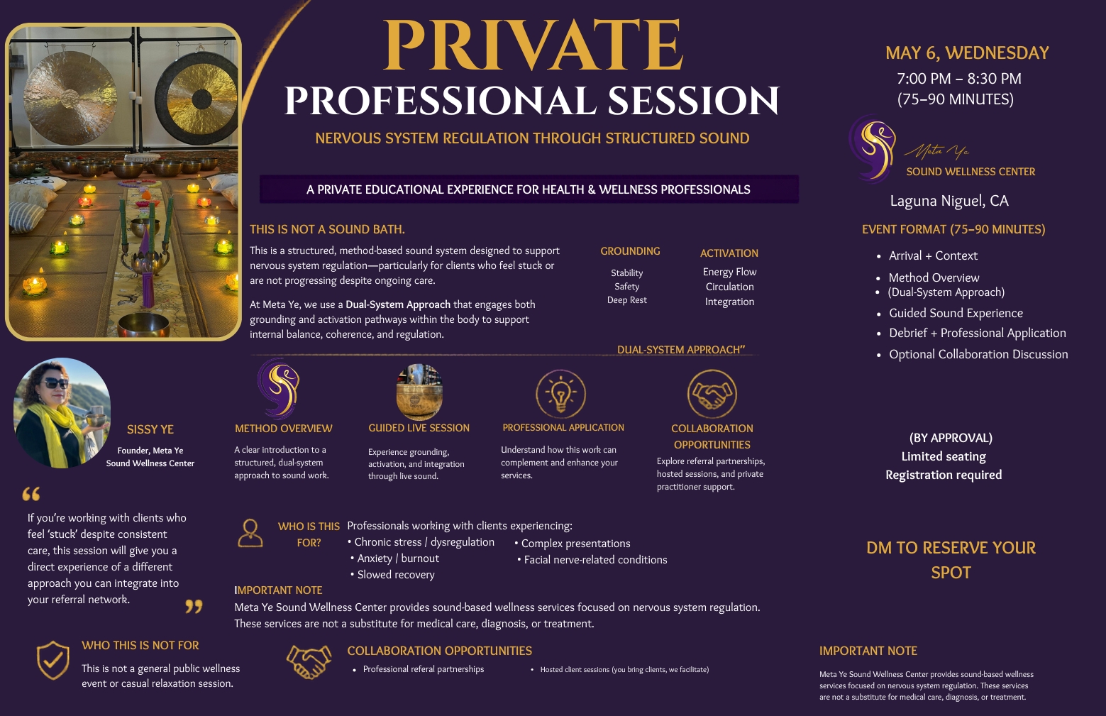 This is a private, small-group professional session for health and wellness practitioners. This is not a sound bath. This is a structured sound-based approach designed to support nervous system